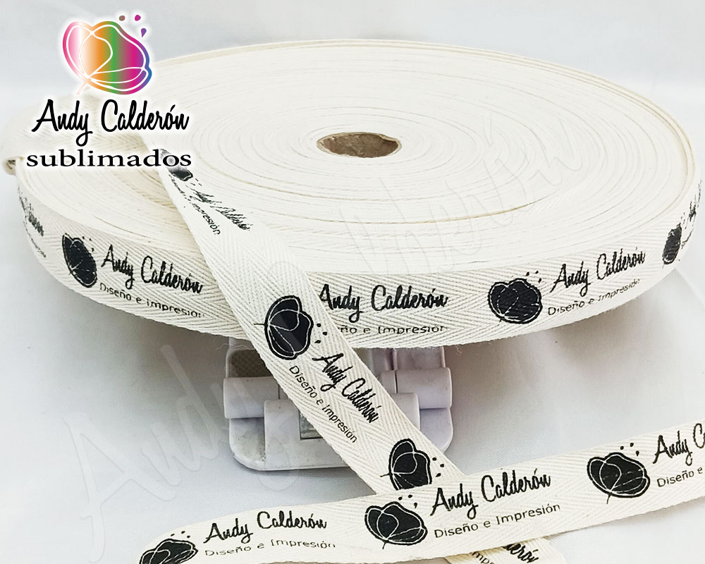 Listón palmita natural,100% algodón de 19 mm ó 1.9 cm de ancho; se Imprime con 1 Tinta de Serigrafía. Tintas Disponibles: Blanca, Negra, Dorada, Plateada, Roja o Azul Reflex.