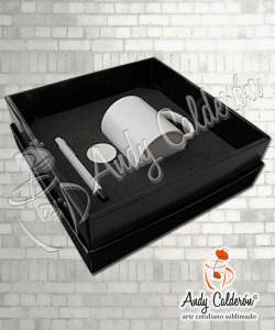 Kit que incluye taza de cerámica para Sublimar, bolígrafo plástico y sujetador stand pop con caja de cartón color negro.