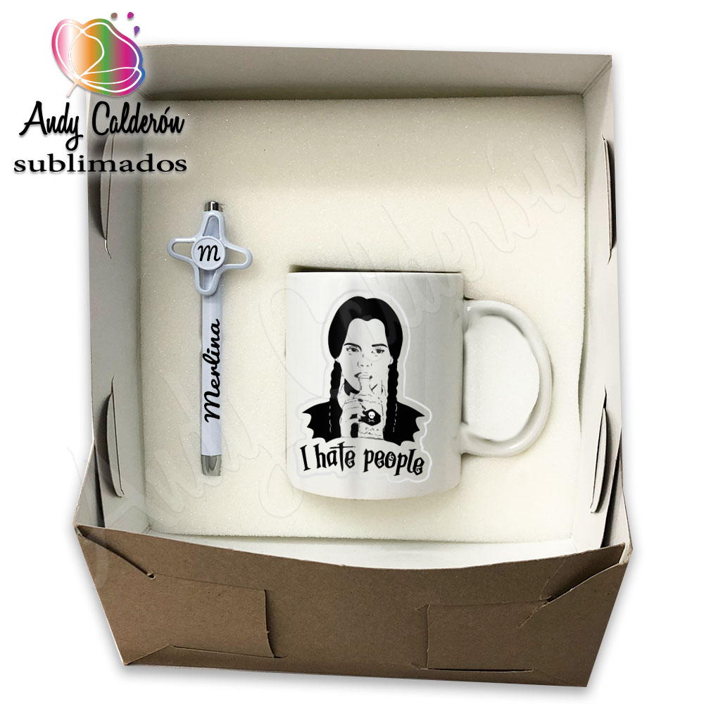 1 TAZA SUBLIMADA, 1 PLUMA PERSONALIZADA CON NOMBRE, 1 CAJA DE CARTÓN CON BASE DE ESPUMA.