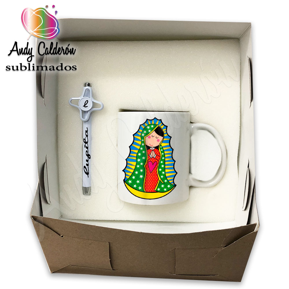 1 TAZA SUBLIMADA, 1 PLUMA PERSONALIZADA CON NOMBRE, 1 CAJA DE CARTÓN CON BASE DE ESPUMA.