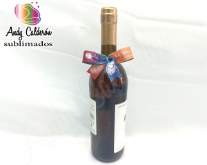 Moño personalizado fabricado con Listón tela Satín, sublimado frente con cualquier diseño y reverso con color solido, terminado con hilo resorte solo para colocar en botella o en regalos, medida final 9.5x5 cm