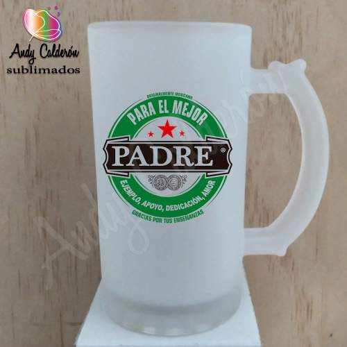 Tarro Cervecero Vidrio Esmerilado SublimadoDiseño: Papá en honor al logo Heineken