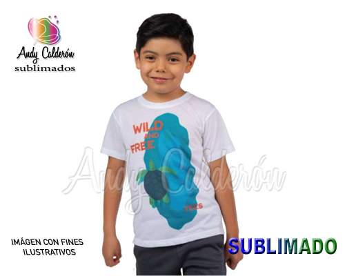 Playera para niño 100% poliéster Sublimación Incluida máxima a todo color de 26 x 20 cms. con la opción de sublimar en la parte de la espalda en un área de sublimación de la misma medida, con costo extra a cotizar. IMAGENES MOSTRADAS SOLO CON FINES ILUSTRATIVOS Precios es cuando recibimos el diseño en programa profesional por parte del cliente totalmente terminado con medida y calidad requerida para producir.