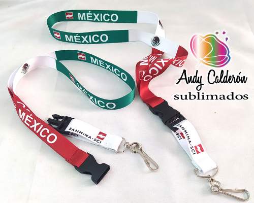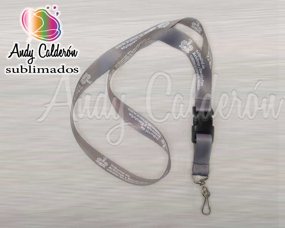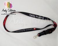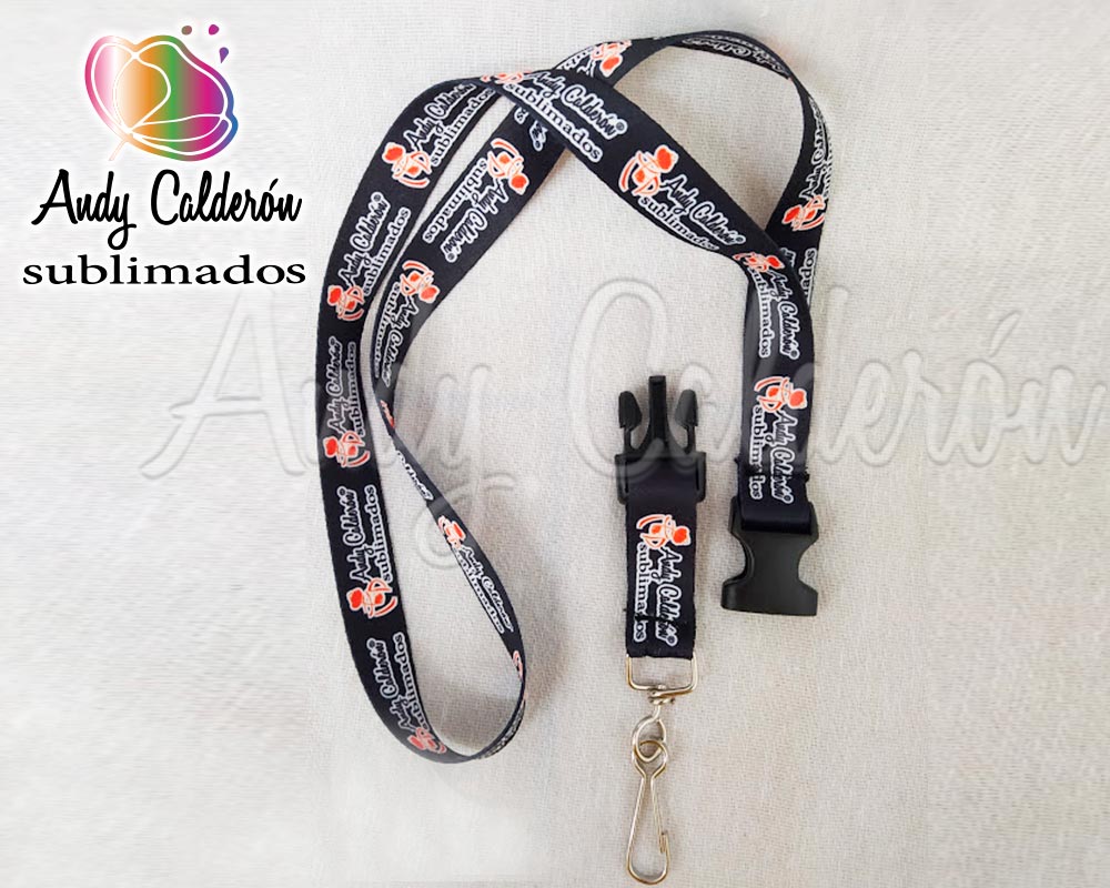 Porta Gafete Fabricado en listón 100% poliéster grueso Sublimada de 19 milímetros de ancho en 2 partes con broche plástico desprendible y bandola SIMPLE giratoria.