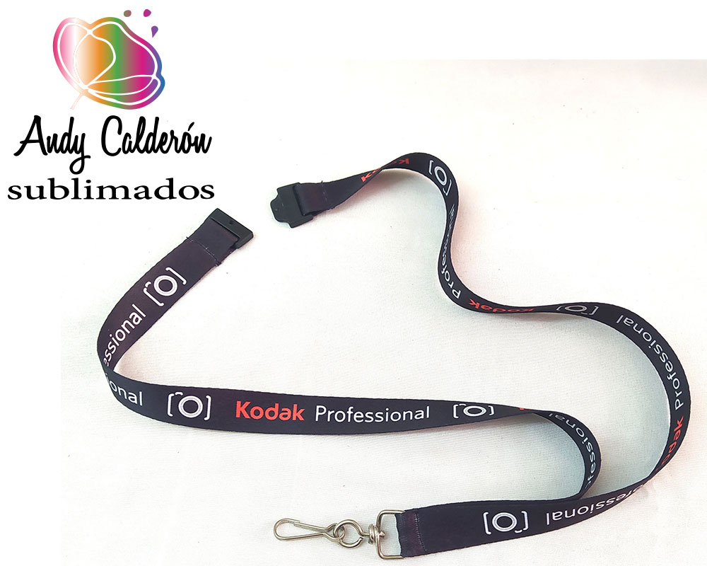 Porta Gafete Fabricado en listón tipo sarga Sublimada de 19 milímetros de ancho con broche plástico anti ahorque y bandola SIMPLE giratoria