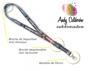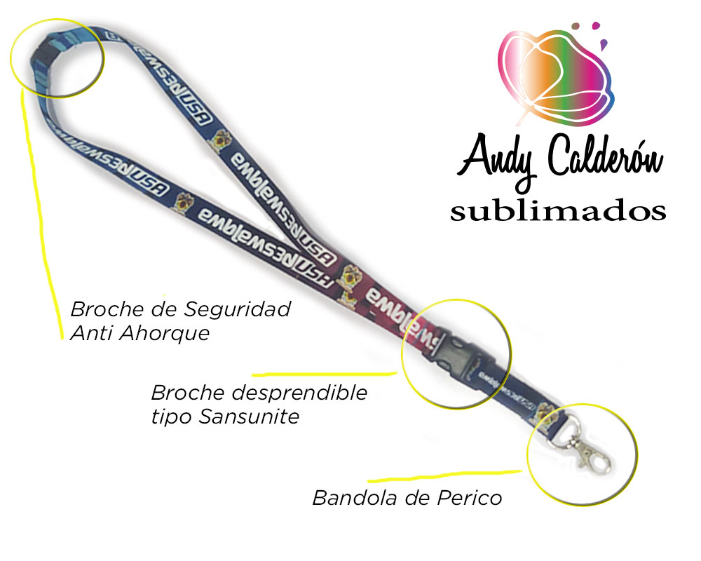Porta Gafete Fabricado en listón tipo sarga Sublimada de 19 milímetros de ancho en 2 partes con broche plástico anti ahorque, broche plástico desprendible y bandola metálica perico